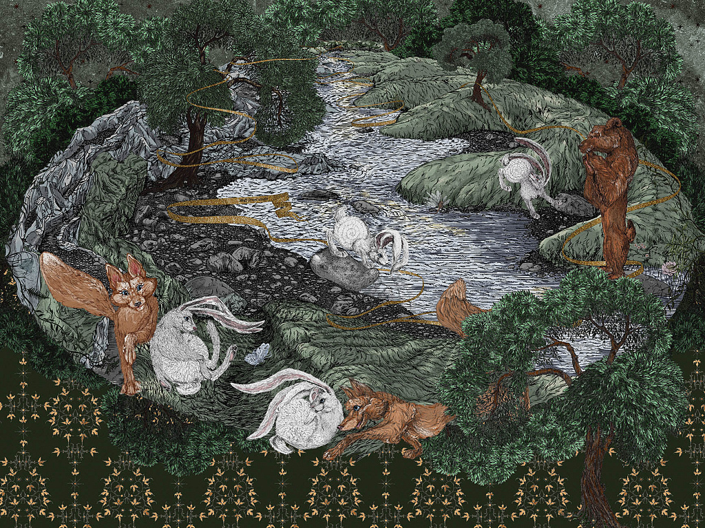 - Рисунок: Животные, Деревья, Река, Живопись, Узор